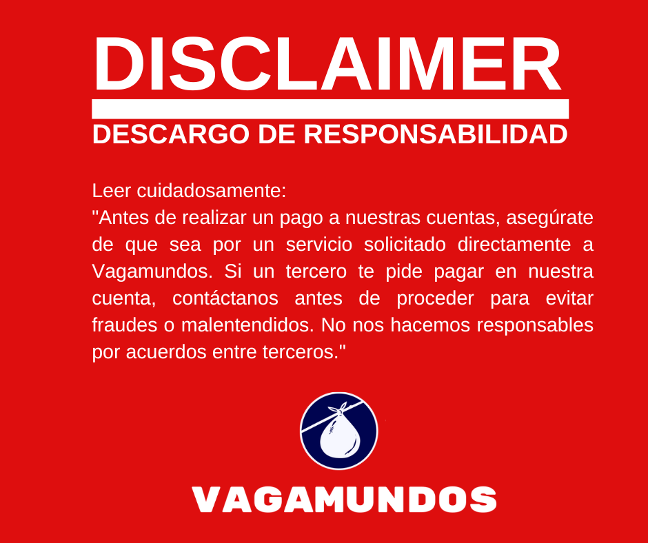 Límites de nuestra responsabilidad: Vagamundos no asume responsabilidad por disputas o problemas derivados de pagos realizados por servicios acordados entre terceros. Si usted realizó un pago a nuestra cuenta, el servicio se entregará únicamente a quien haya solicitado el servicio directamente y presentado el comprobante de pago correspondiente.